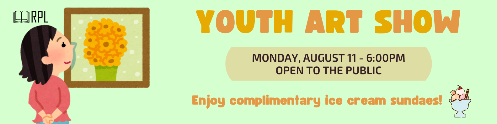 Stop by the library to browse art that our young artists made this summer in the Colors of Nature program! Enjoy a complimentary ice cream sundae!