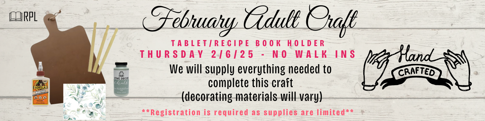 February 6 @ 5:30 pm - 7:00 pm Adult Craft Night! Come and enjoy a relaxing and creative evening with Kelly.